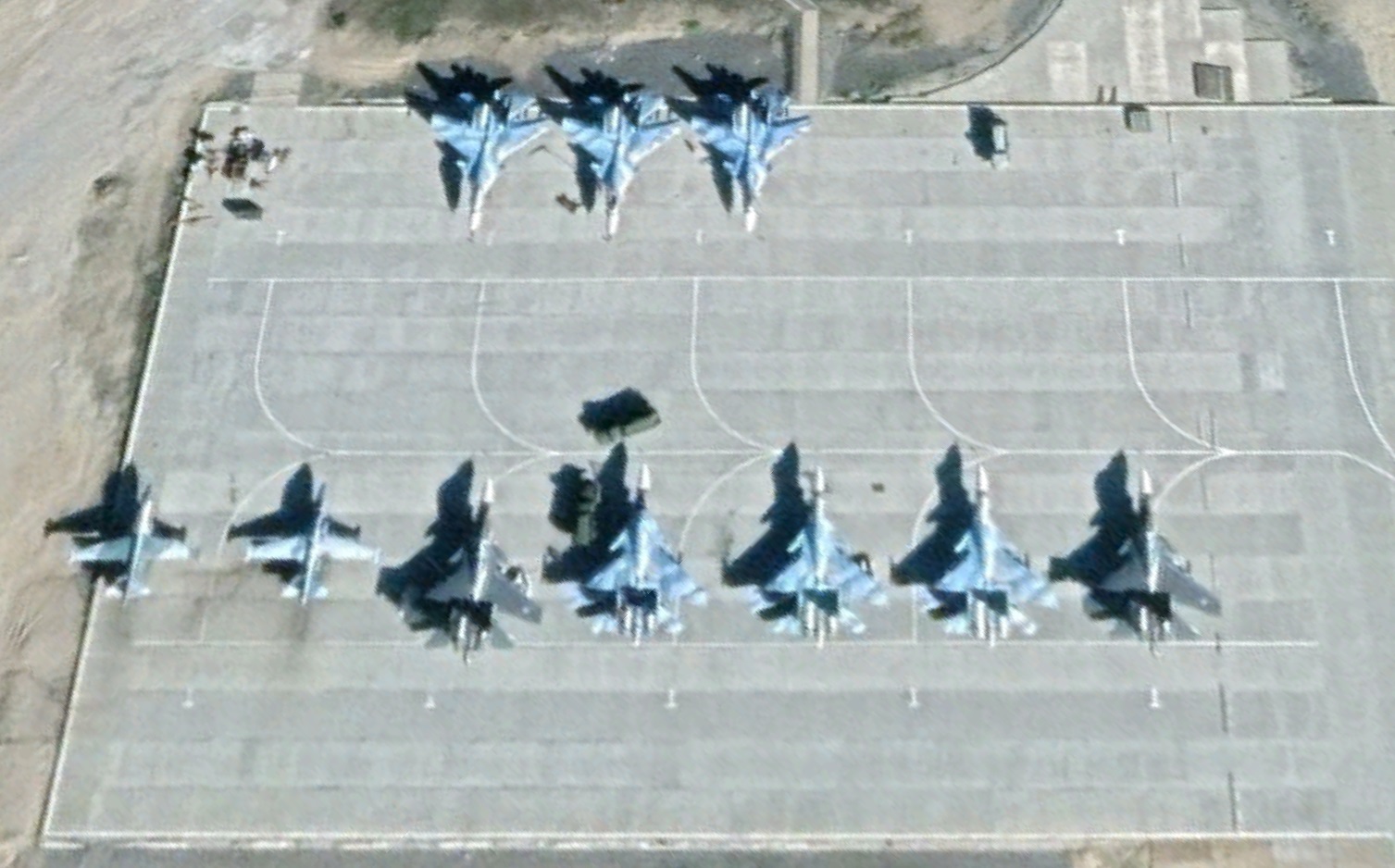 近期的衞星地圖上,第279團的蘇-33(海洋迷彩)、蘇-30SM(“茄子色”)和蘇-25UTG艦載教練機停在一起,它們主要的訓練內容,是與同樣無需參戰的100團米格-29K互為對手