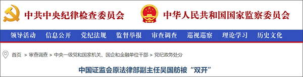 據中央紀委國家監委網站7月13日消息,據中央紀委國家監委駐中國證券監督管理委員會紀檢監察組、江蘇省紀委監委消息:日前,經中央紀委國家監委批准,中央紀委國家監委駐中國證券監督管理委員會紀檢監察組與江蘇省無錫市紀委監委對中國證監會原法律部副主任吳國舫嚴重違紀違法問題進行了紀律審查和監察調查。