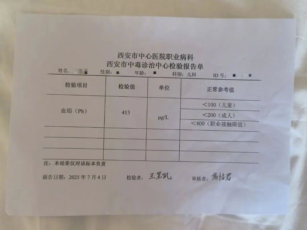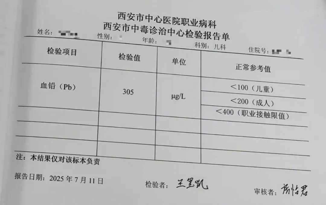 耿偉(化名)孩子在西安市中心醫院7月4日和7月11日的兩次檢驗中,血鉛濃度分別為413微克/升和305微克/升。圖/受訪者提供