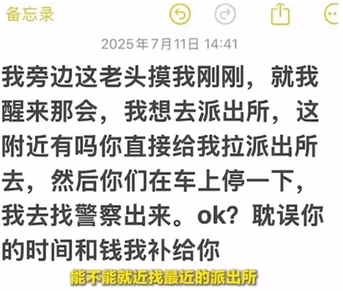 另據紅星新聞報道,程女士介紹,她是律師,當時意識到遭遇猥褻後,她曾詢問同車女乘客是否遭遇同樣猥褻行為。隨後,她將寫有求助內容的備忘錄遞給司機看,“一開始他有點呆住了,然後我拍了拍他的肩膀,問先送我行不行。他説好。”