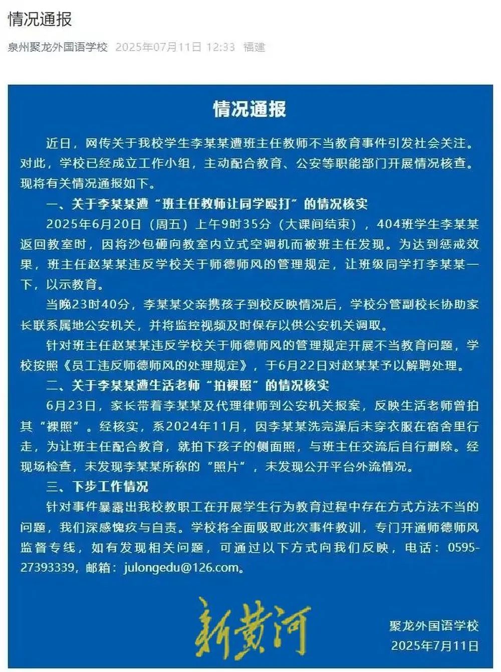 13日下午,記者撥打聚龍外國語學校在發佈情況通報中公佈的師德師風監督熱線電話。一名工作人員稱,事件相關情況都在學校發佈的情況通報中,且這個電話只是受理學校師德師風的監督。隨後,記者又撥打學校官網上公佈的聯繫電話,工作人員稱不能代表學校接受媒體採訪,會將相關情況向學校領導進行反饋。
