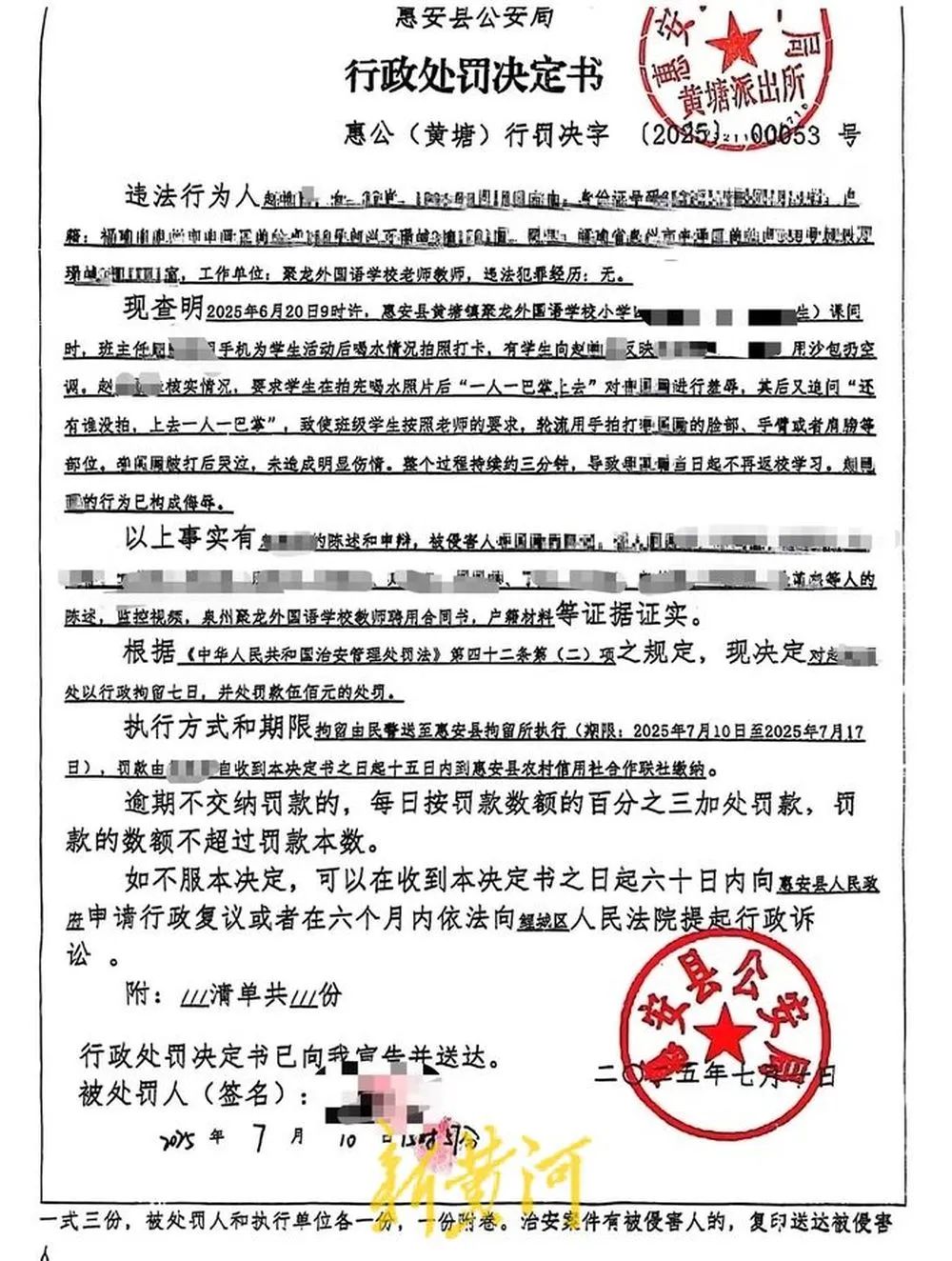 13日,被打學生家長告訴新黃河記者,學校通報隱瞞事實,早在7月10日,泉州市惠安縣公安局就出具了《行政處罰決定書》,上面內容顯示,“現查明,趙某某要求學生‘一人一巴掌上去’對李某某進行羞辱,其後又追問‘還有誰沒拍,上去一人一巴掌’,致使班級學生按照老師的要求,輪流用手拍打李某某的臉部、手臂或者肩膀等部位,整個過程持續約三分鐘,趙某某的行為已構成侮辱。”