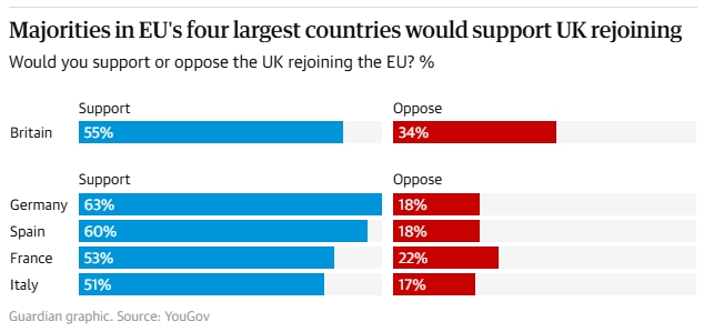 調查顯示,在歐盟四大成員國(法國、德國、意大利和西班牙)中,至少有一半受訪者支持英國重新加入:意大利(51%)、法國(53%)、西班牙(60%)、德國(63%)。