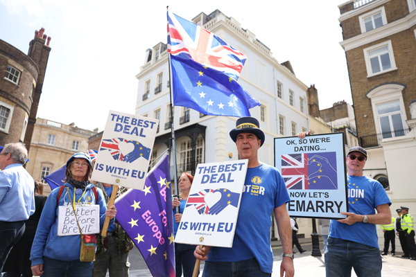 當地時間2025年5月19日,英國倫敦,英國與歐盟舉行雙邊峯會期間,反對英國脱歐的抗議者集會示威。 IC photo