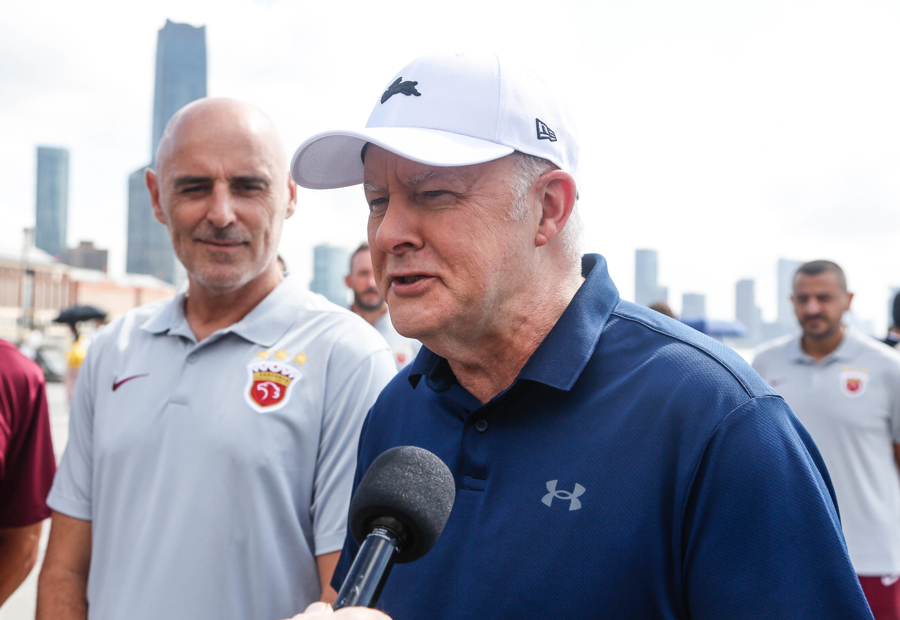 7月13日上午,上海市領導會見了澳大利亞總理阿爾巴尼斯。有意思的是,上海海港隊主帥穆斯卡特領銜的澳大利亞教練組及隊長王燊超一行六人,當日清晨陪同阿爾巴尼斯總理在外灘一起晨練散步,並送上了專屬冠軍戰袍。