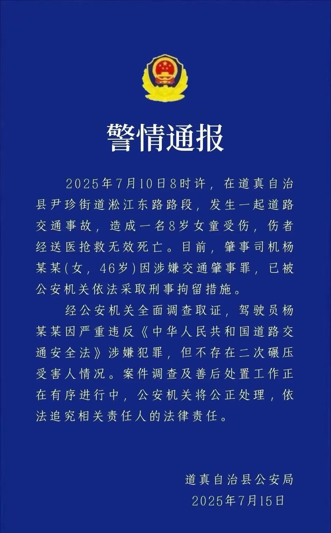 2025年7月10日8時許,在道真自治縣尹珍街道淞江東路路段,發生一起道路交通事故,造成一名8歲女童受傷,傷者經送醫搶救無效死亡。目前,肇事司機楊某某(女,46歲)因涉嫌交通肇事罪,已被公安機關依法採取刑事拘留措施。
