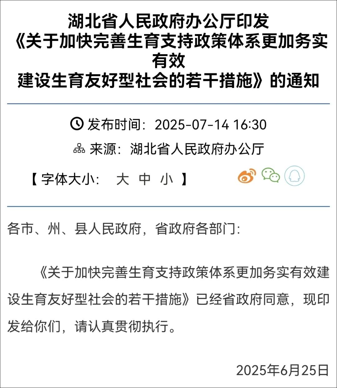 14日,湖北省人民政府辦公廳印發《關於加快完善生育支持政策體系更加務實有效建設生育友好型社會的若干措施》的通知。