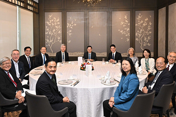 李家超(中)主持特首顧問團午餐會議,以聽取顧問團成員就2025年施政報告的意見。 香港政府新聞網