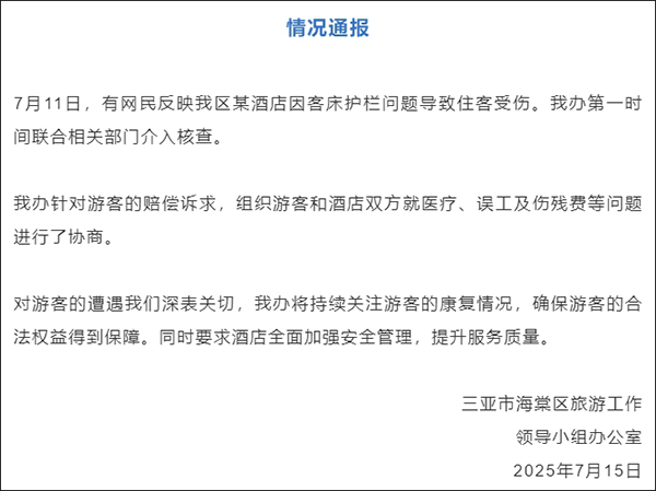 據三亞市海棠區委宣傳部微信公眾號“海棠發佈”消息,7月15日,三亞市海棠區旅遊工作領導小組辦公室發佈情況通報稱,7月11日,有網民反映我區某酒店因客牀護欄問題導致住客受傷。我辦第一時間聯合相關部門介入核查。