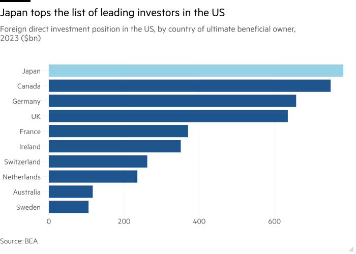 2023年,日本是美國最大的外國直接投資來源國 製圖:《金融時報》