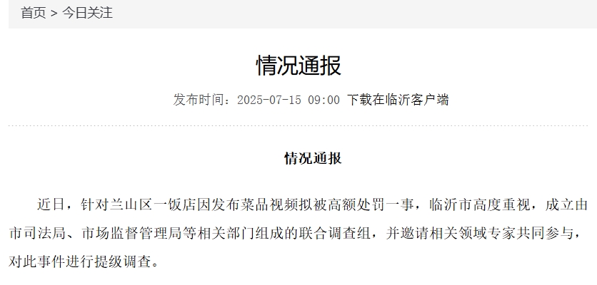 通報稱,近日,針對蘭山區一飯店因發佈菜品視頻擬被高額處罰一事,臨沂市高度重視,成立由市司法局、市場監督管理局等相關部門組成的聯合調查組,並邀請相關領域專家共同參與,對此事件進行提級調查。