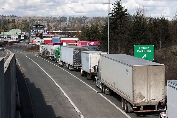 3月5日,火車排隊通過美加邊境。 視覺中國