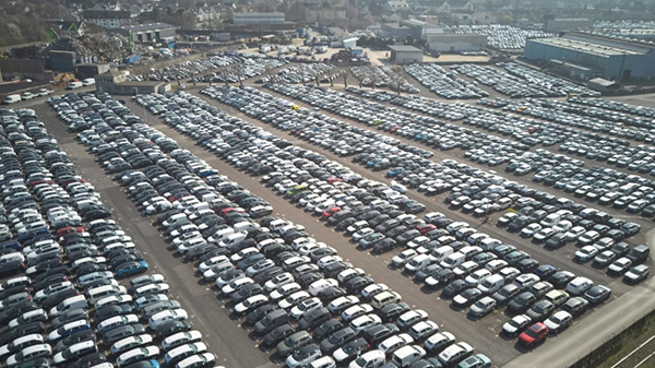新車停放在德國的一個物流中心裏。 視頻截圖