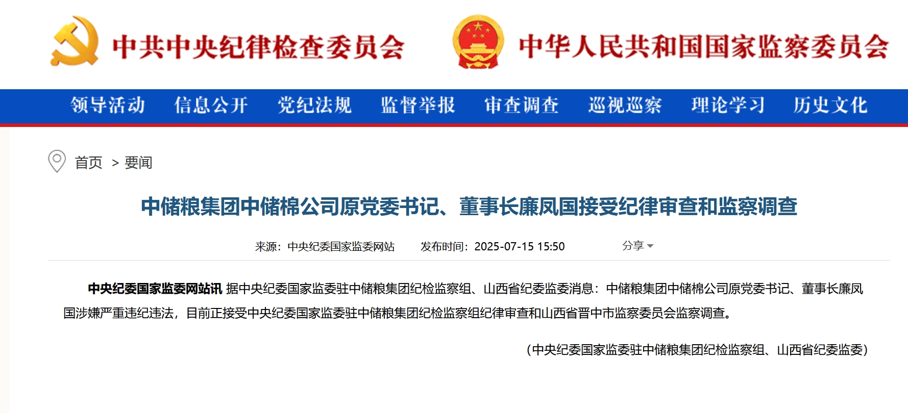中央紀委國家監委網站7月15日發佈,據中央紀委國家監委駐中儲糧集團紀檢監察組、山西省紀委監委消息:中儲糧集團中儲棉公司原黨委書記、董事長廉鳳國涉嫌嚴重違紀違法,目前正接受中央紀委國家監委駐中儲糧集團紀檢監察組紀律審查和山西省晉中市監察委員會監察調查。