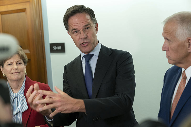 當地時間7月15日,北約秘書長馬克·呂特在美國國會山舉行記者會,美國民主黨參議員珍妮·沙欣(左)和共和黨參議員湯姆·提利斯陪同出席。 視覺中國