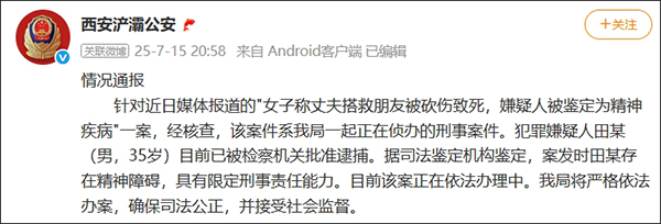 陝西西安市公安局滻灞生態區分局官方微博@西安滻灞公安 7月15日發佈情況通報稱,針對近日媒體報道的“女子稱丈夫搭救朋友被砍傷致死,嫌疑人被鑑定為精神疾病”一案,經核查,該案件系我局一起正在偵辦的刑事案件。犯罪嫌疑人田某(男,35歲)目前已被檢察機關批准逮捕。據司法鑑定機構鑑定,案發時田某存在精神障礙,具有限定刑事責任能力。目前該案正在依法辦理中。我局將嚴格依法辦案,確保司法公正,並接受社會監督。
