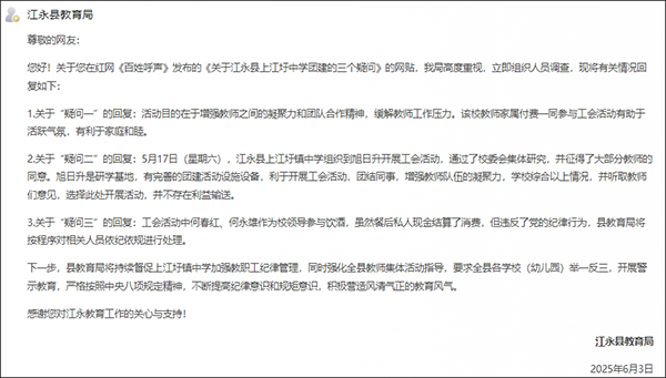 6月3日,江永縣教育局回應稱,團建活動目的在於增強教師之間的凝聚力和團隊合作精神,緩解教師工作壓力。該校教師家屬付費一同參與工會活動有助於活躍氣氛,有利於家庭和睦。