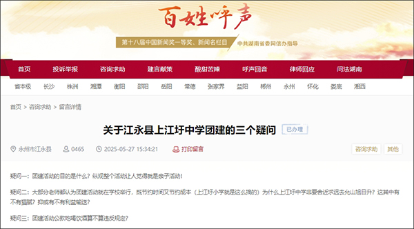 5月17日,曾有網民在紅網“百姓呼聲”網站提出關於江永縣上江圩中學團建的三個疑問,包括團建活動的目的是什麼?為什麼上江圩中學非要捨近求遠舉行團建活動?團建活動公款吃喝飲酒算不算違反規定?