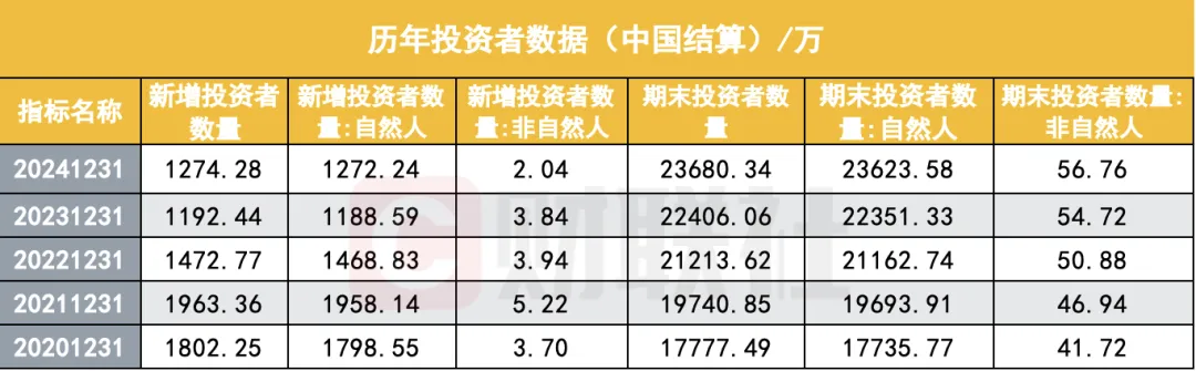 對比2021-2024年數據,機構投資者新增數量呈逐年下降趨勢:2021年新增5.22萬人,2022年3.94萬人,2023年3.84萬人,2024年降至2.04萬人。與之相對,個人投資者新增數量雖有波動(2022年1468.83萬、2023年1188.59萬、2024年1272.24萬),但整體保持千萬級穩定規模。
