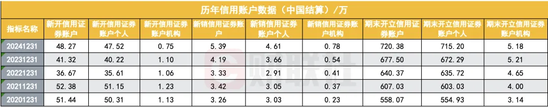根據中國結算數據,2024年底,期末開立信用賬户的投資者達720.38萬人,較2023年底的677.50萬增長6.33%,其中個人信用賬户715.20萬,機構5.18萬。