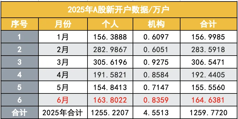 結合上交所數據,2025年上半年A股新開户合計1259.77萬户,其中個人投資者開户1255.22萬户,機構投資者4.55萬户。