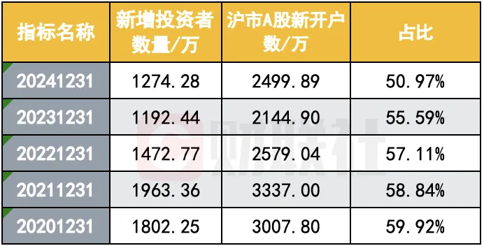 以2025年上半年為例,上交所數據顯示A股新開户合計1259.77萬户。若參照“比例超50%且下降”的規律,按相對50%比例估算,背後對應的新增投資者數量為629.89萬人(1259.77萬户×50%),這一結果更貼合曆年比例特徵。