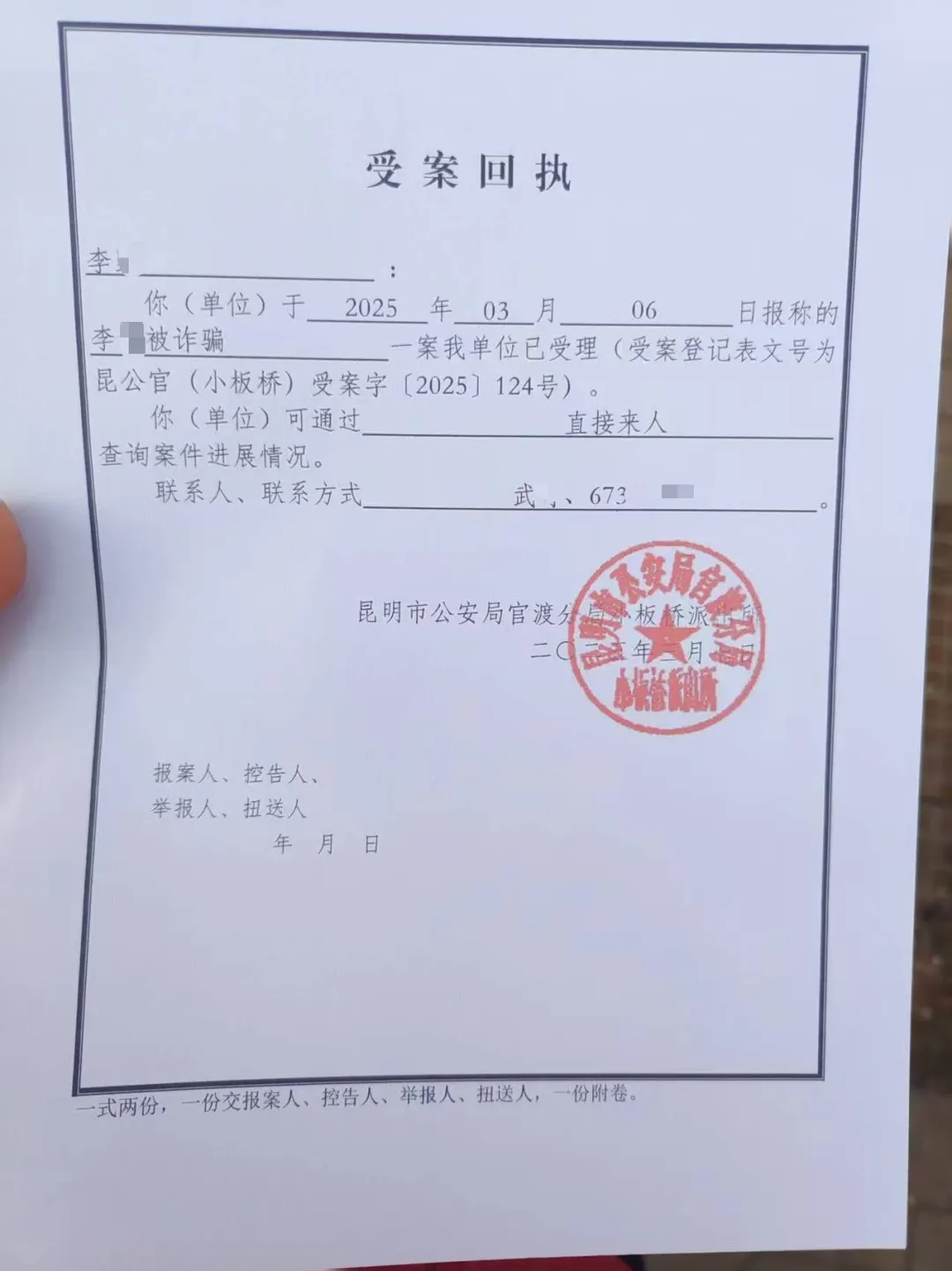 在有關部門的建議下,李敏向交易地點所在的派出所報警。3月7日,昆明市公安局官渡區分局小板橋派出所受理此案。派出所在受案回執中建議,後續當事人可通過“直接來人”的方式查詢案件進展。