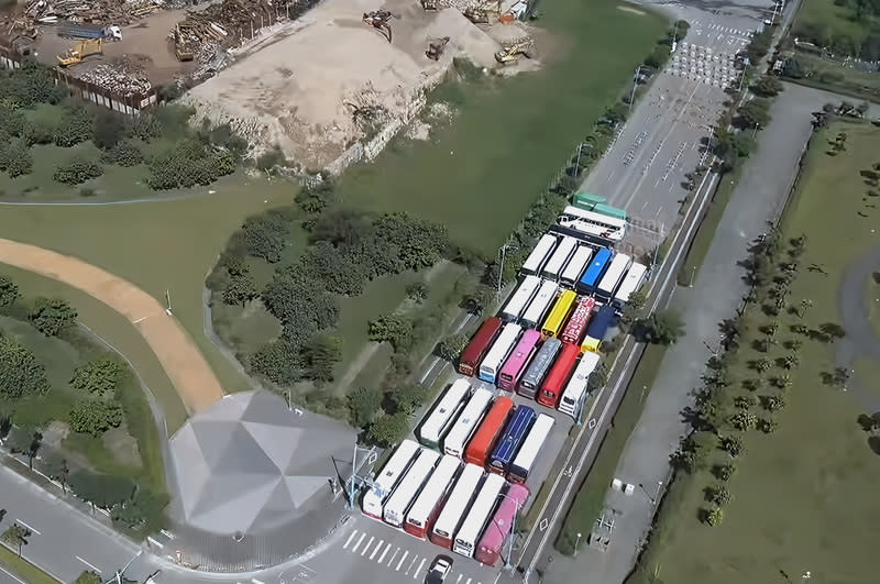 15日演練中在新北市八里區商港九路設置的“6道阻絕”障礙物,包括常規的混凝土預製塊、拒馬、鐵絲網,以及集裝箱、民用旅遊大客車等 台媒
