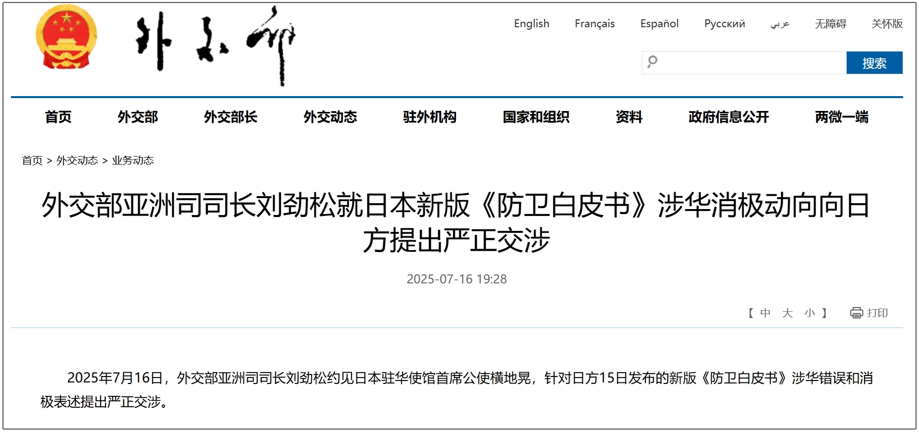 外交部亞洲司司長就日本新版《防衞白皮書》向日方提出嚴正交涉 guancha 2025-07-16 外交部網站消息,2025年7月16日,外交部亞洲司司長劉勁松約見日本駐華使館首席公使橫地晃,針對日方15日發佈的新版《防衞白皮書》涉華錯誤和消極表述提出嚴正交涉。