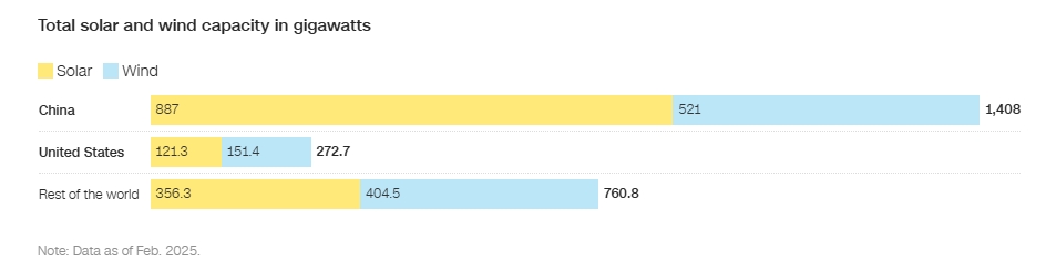 根據全球能源監測組織數據,中國目前正在建設510吉瓦的公用事業規模太陽能和風能容量,加上已併網的1400吉瓦(相當於美國總量的5倍),對美國形成碾壓性優勢。