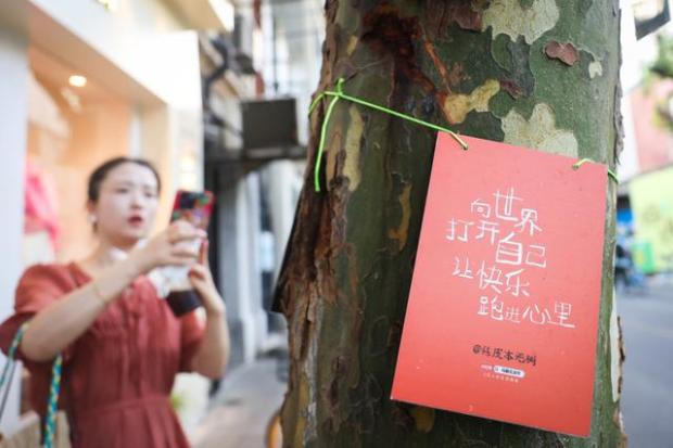 小紅書“馬路生活節”期間,淡水路上的梧桐樹上,綁着小紅書博主的投稿作品。