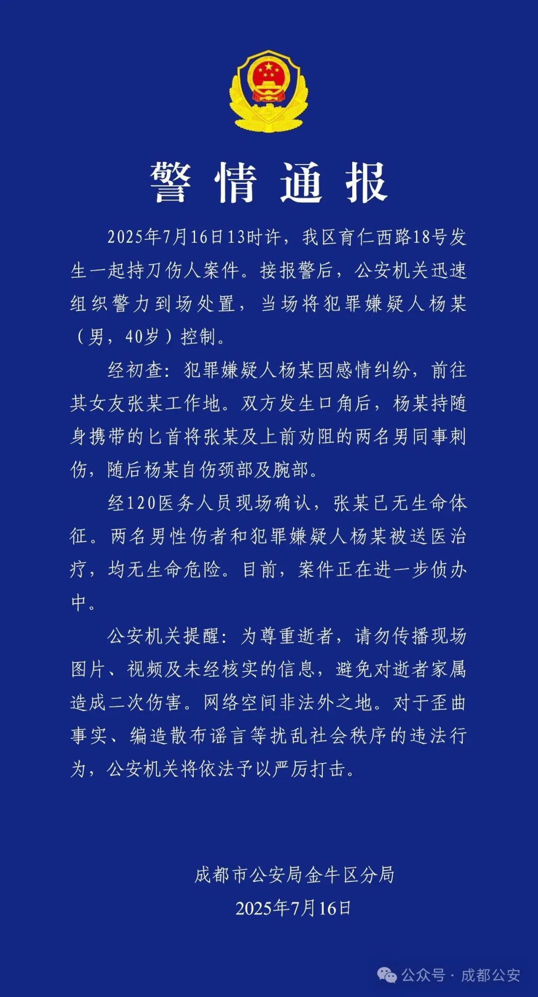 男子因感情糾紛持刀刺死女友,成都警方通報