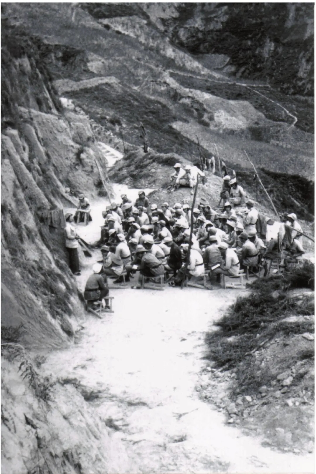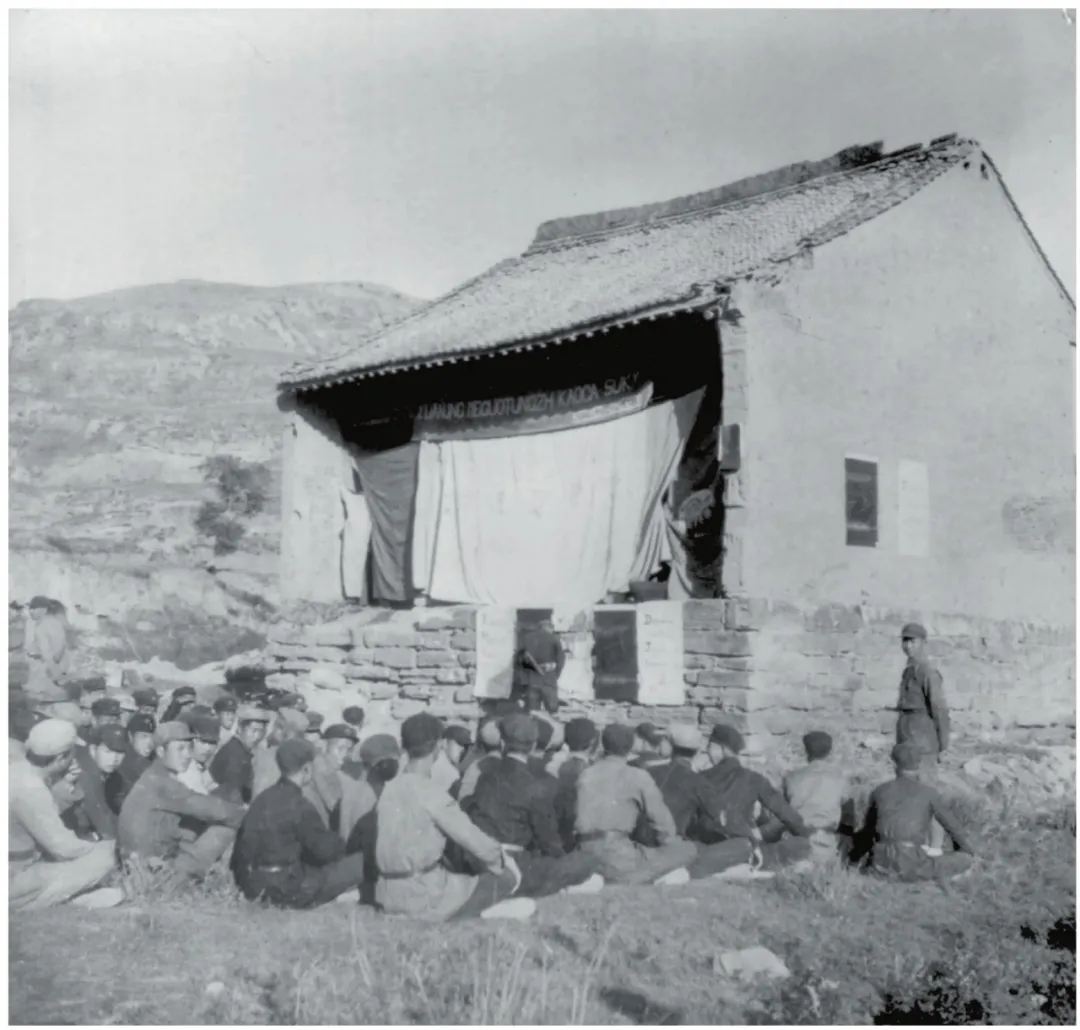 他説,那是一個用古廟臨時改建的露天劇場,學員、騾夫、婦女、被服工廠和鞋襪工廠的女工、合作社職工、蘇區郵局職工、士兵、木工、拖兒帶女的村民,都向河邊那塊大草地湧過去。演員們就在那裏演出,不遠處甚至還有幾頭羊在啃䓍。
