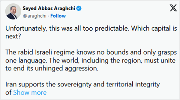 “不幸的是,這一切都是意料之中的。下一個是哪個首都?瘋狂的以色列政權沒有邊界,只聽得懂一種語言。全世界,包括本地區,必須團結起來終結其瘋狂侵略行為。”伊朗外長阿巴斯·阿拉格奇對以色列予以譴責。