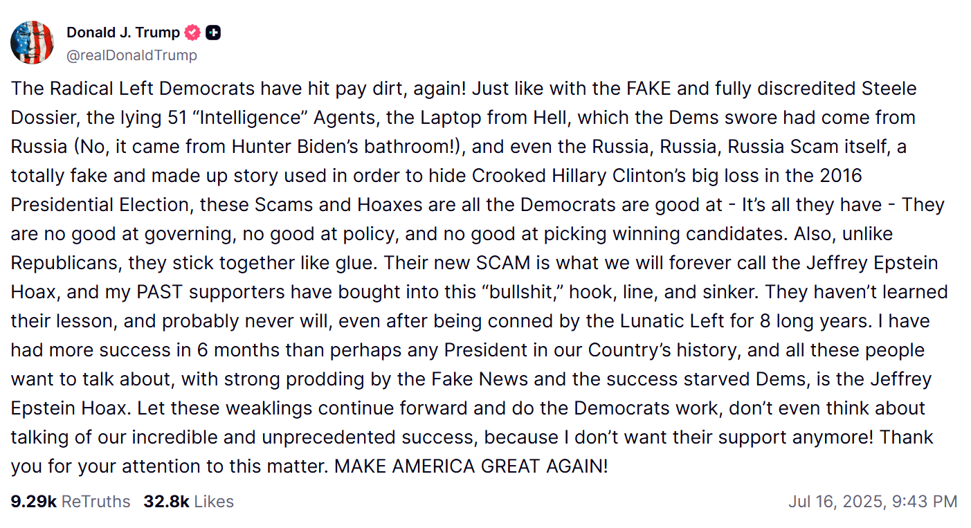 據美國有線電視新聞網(CNN)7月16日報道,由於大量支持者都對特朗普在愛潑斯坦案上的處理方式不滿意,特朗普反過來指責他們竟然完全相信被民主黨的騙局,並表示不再需要這些人的支持。