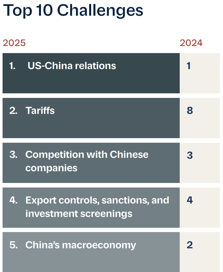 在所有主要關注問題中,“關税”從第八位升至第二位。調查發現,製造業和科技行業受關税衝擊最大,近90%的相關美企報告稱“運營受阻”。企業迫切希望貿易談判能夠終止無差別關税。