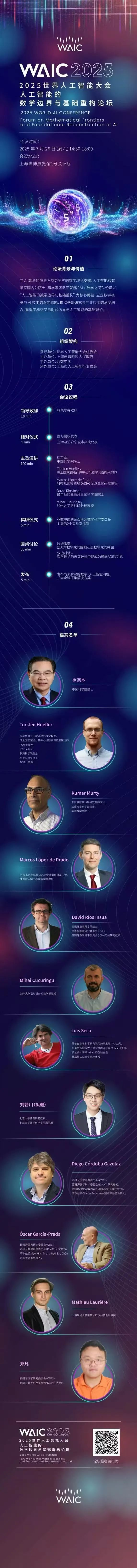 7月26日14:30-17:30, 2025世界人工智能大會(WAIC)期間,主題論壇“人工智能的數學邊界與基礎重構論壇”將在上海世博展覽館1號會議廳重磅登場。