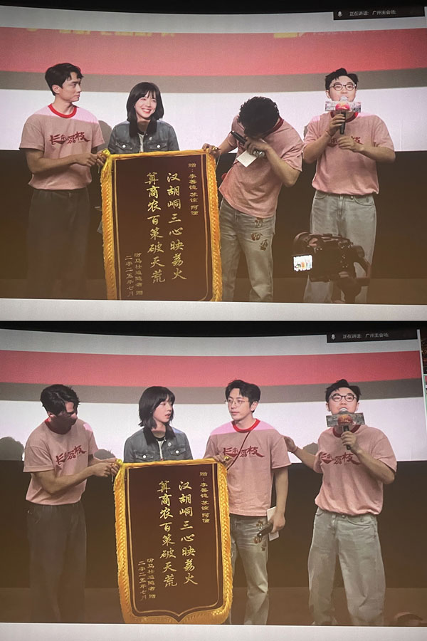 7月12日,(右起)大鵬、白客、莊達菲、劉俊謙參加《長安的荔枝》四城雲路演,“盼馬壯”的追隨者送上錦旗。 新潮觀魚 攝