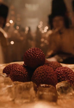 當李善德費盡千辛萬苦,一人一馬趕至貴妃誕辰慶典,嶺南兩百叢荔枝中唯一“倖存”的一甕新鮮荔枝由人端上桌,電影鏡頭停留在荔枝特寫,沒有展現貴妃品嚐的畫面。