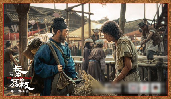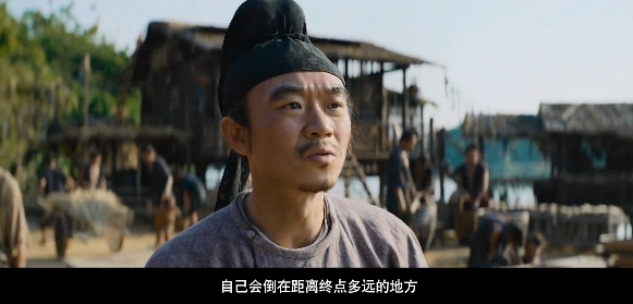 電影中有一幕令人印象深刻,李善德遭遇逃驛、計劃被打亂後,派林邑奴提前去下站尋求幫助,讓冰塊通過水路來“接”荔枝,在前路無望的水面上,最後出現的救兵是前不久與李善德決裂的蘇諒。倆人隔着大老遠相視一笑,萬萬沒想到。