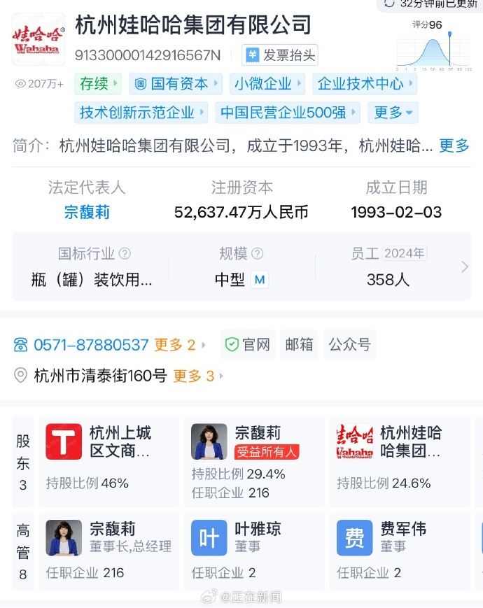 工商信息顯示,杭州娃哈哈集團有限公司(下稱“娃哈哈集團”)大股東為杭州市上城區財政局下屬二級企業杭州市上城區文商旅投資控股集團有限公司。