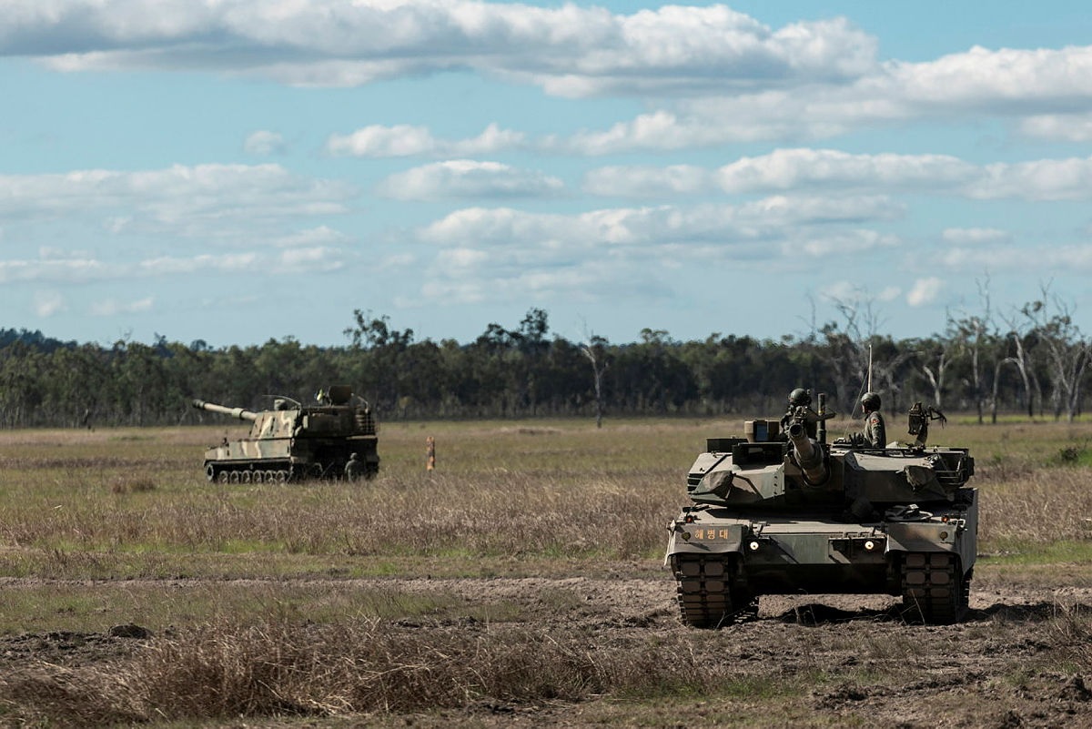 演習中的韓軍K9自行火炮(左)和K1A2坦克(右) 澳大利亞國防部