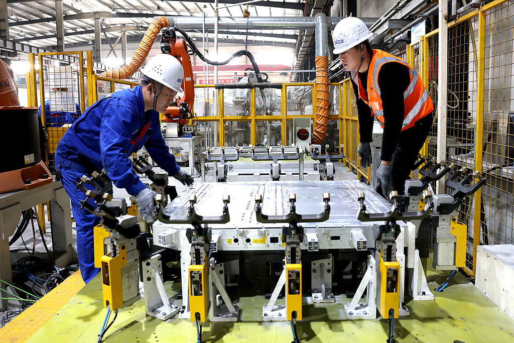 2025年2月17日,福建寧德,東僑經濟技術開發區,一家新能源科技企業的生產車間,工人們在趕製新能源汽車動力電池殼產品 視覺中國