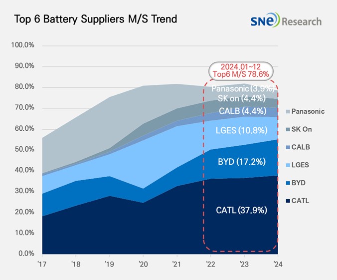 2024年,全球電動汽車電池市場排名前6的企業份額 SNE Reseawrh