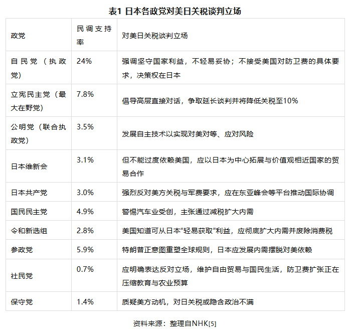 但這些舉措並未能使日本豁免於特朗普掀起的“解放日”關税衝擊。日本是最早啓動對美談判的國家,特朗普也意圖將日本打造為“談判模版”,但進展緩慢,反而遲於英國、中國及越南與美國達成初步框架協議的節奏。至今,美日之間已舉行了七輪磋商,部長級談判仍在繼續推進。日美關税談判僵局也成為朝野攻防焦點。在7月初的NHK參議院選舉黨首辯論節目中,部分在野黨呼籲更積極的應對策略,認為應聯合其他經濟體共同向美方施壓,同時提升日本戰略自主性。(表1)