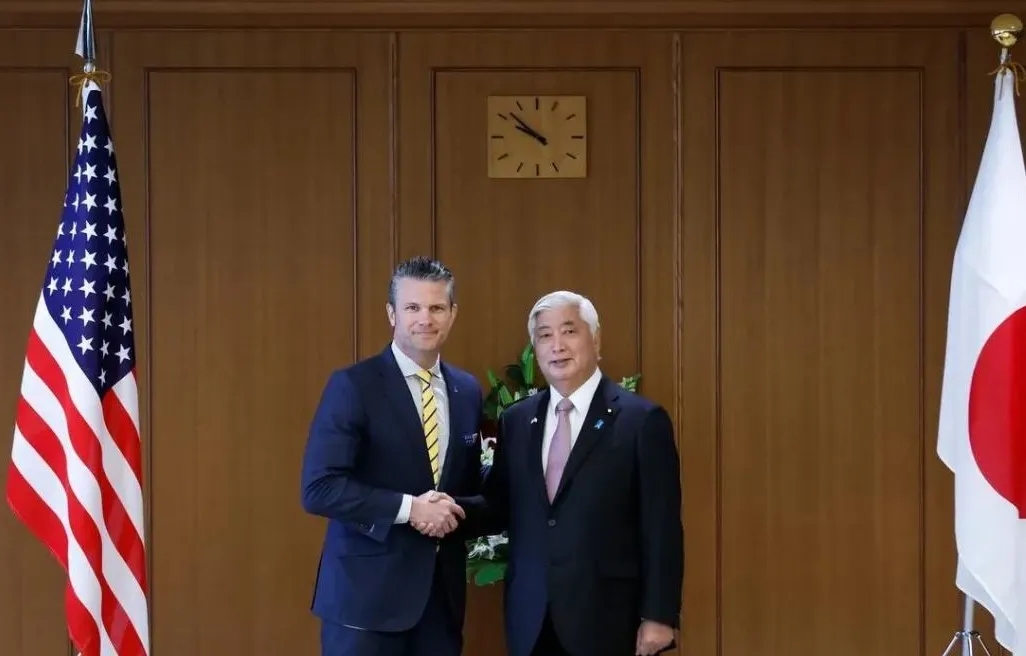 美國防長赫格塞斯(左)在東京與日本防長中谷元(右)會面。圖源:路透社