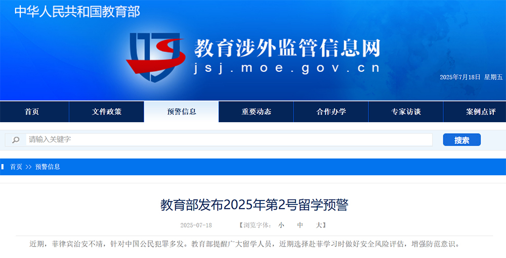 據教育部教育涉外監管信息網消息,7月18日,教育部發布2025年第2號留學預警:
