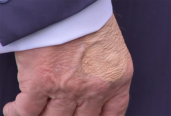 攝像機捕捉到的畫面顯示,特朗普手背出現淤青,塗抹了遮瑕膏以掩飾 視頻截圖