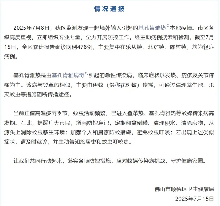 據國家應急廣播微信公眾號消息,7月15日,廣東佛山順德區衞生健康局發佈通報,稱全區已確診478例基孔肯雅熱,均為輕症病例。