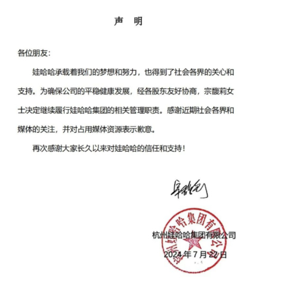 經過其後數天輿情發酵,娃哈哈集團官網最終在7月22日發佈聲明稱:“為確保公司的平穩健康發展,經各股東友好協商,宗馥莉女士決定繼續履行娃哈哈集團的相關管理職責”。